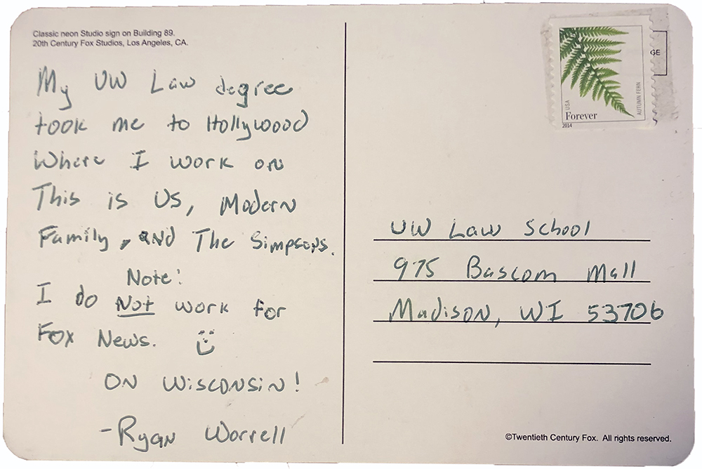 “My law degree took me to Hollywood where I work on This Is Us, Modern Family, and The Simpsons. Note: I do not work for Fox News. 🙂 On Wisconsin!”
